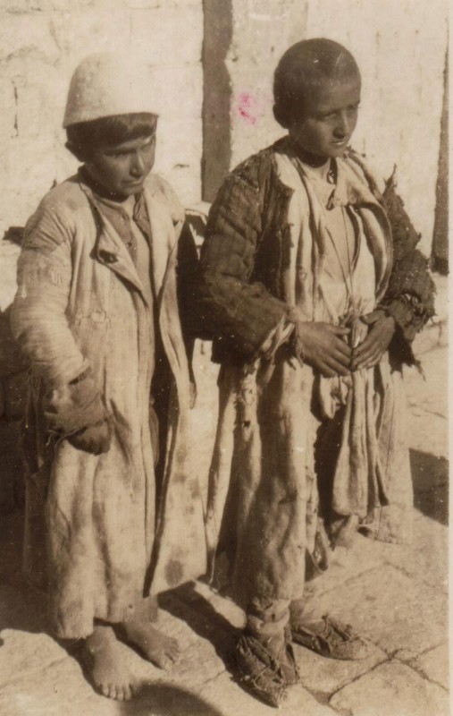 Near East Relief was founded to save the survivors of the Armenian Genocide. Tens of thousands of these survivors were young children. They lived on scavenged food scraps and dressed in whatever rags they could find. It was an unprecedented humanitarian crisis. Missionaries and Near East Relief workers set out to gather the children into orphanages. This photograph of two young survivors is probably from Syria, circa 1922.