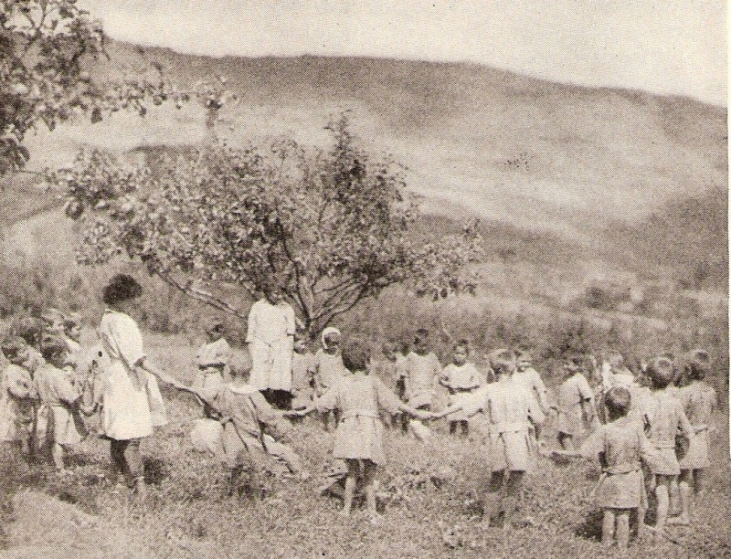 After a lifetime of adversity, the children struggled to learn to be children. Laughing and playing did not come to them automatically. Older and younger children often formed their own small groups to mimic families. In addition to studying school subjects and learning trades, part of each day was devoted to playtime. In this photograph, a group of kindergartners enjoy a circle dance with their teacher on a sunny afternoon.
