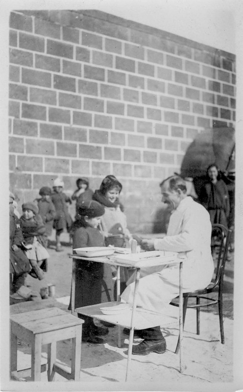 Many of the first Near East Relief volunteers were doctors and nurses. Medical care and disease prevention were important parts of the relief effort. Near East Relief ran many hospitals and small clinics to care for orphans and refugees. There were even a few mobile health wagons that traveled into the surrounding communities. In this photograph, a doctor consults with his patients in a courtyard in the Caucasus.