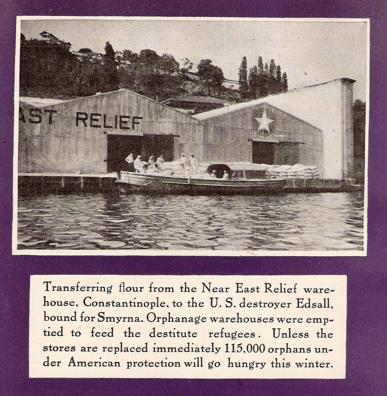 Near East Relief sent its first food shipment on the Mercurius on January 16, 1919. The ship contained 2,000 pounds of flour, 2,500 cases of canned food, and 500 cases of condensed milk. The Pensacola and the Western Belle quickly followed with a combined $3,500,000 worth of food and supplies. The U.S.S. Datchet (left) carried 4,500 tons of flour, rice, and beans in 1920.
