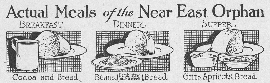 Orphanage meals delivered the maximum number of calories for the smallest price possible. Relief worker Nettie Hall Austin implemented a rationing system in Samsoun with a food budget of $1.95 per child per month (about $25 in 2015 dollars). The orphanage kitchens relied on starchy foods like bread and potatoes to keep young bellies feeling full. Condensed milk was rich in calcium and vitamins. In times of scarcity, milk was thinned with water or reserved for ill children. Holidays might be celebrated with nuts and dried fruit.