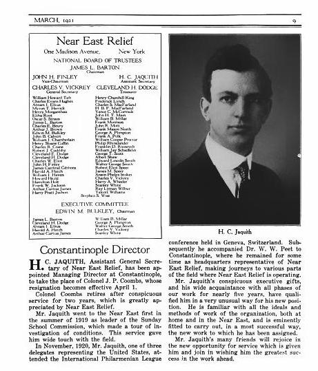 H.C. Jaquith became the Associate General Secretary of Near East Relief in 1927. He was instrumental in overseeing the transition from Near East Relief to the Near East Foundation over the course of several years.