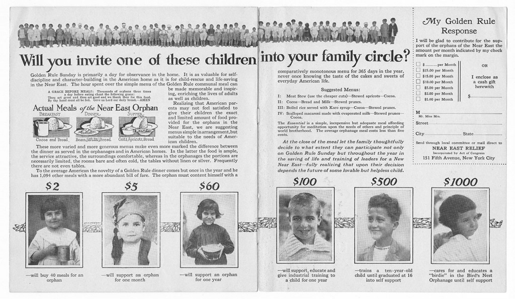 Vickrey launched one of Near East Relief’s most famous promotional campaigns in 1923. In six short weeks, Vickrey organized the first ever Golden Rule Sunday on December 2. Families would eat a meal similar to those served in Near East Relief orphanages and donate the money that they would have spent on a traditional Sunday dinner to the relief effort.The New York Times reported that former President Wilson, a longtime Near East Relief supporter, had promised to dine on beans and corn grits in observance of Golden Rule Sunday. Several members of Congress signed Golden Rule pledge cards. President Coolidge announced that the Coolidge family and the presidential cabinet would participate.