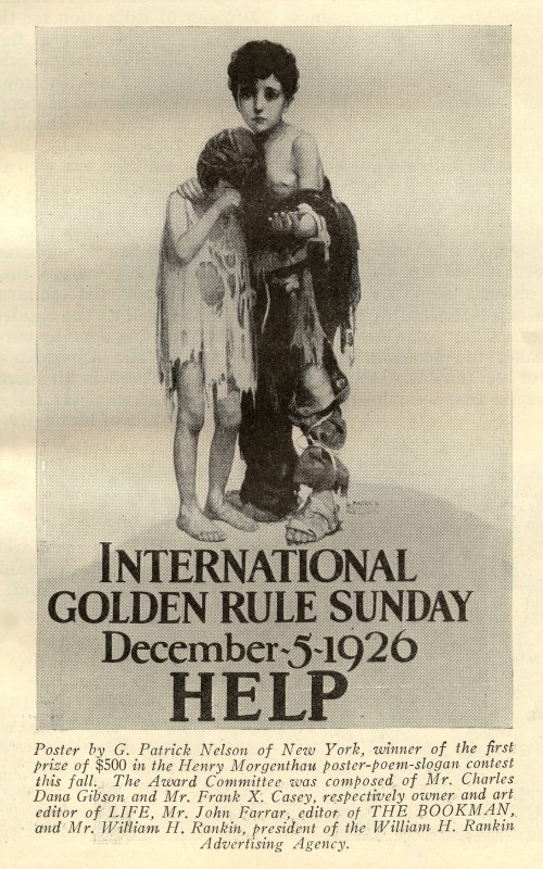 Near East Relief published Vickrey’s Golden Rule Sunday: A Handbook in 1926. The book contained everything needed to organize a Golden Rule event in one’s own town, including instructions for recruiting prominent businessmen and clubwomen to serve on a leadership committee. The book also featured photographs of successful Golden Rule events, poems and readings, and even sheet music for an original Golden Rule hymn.