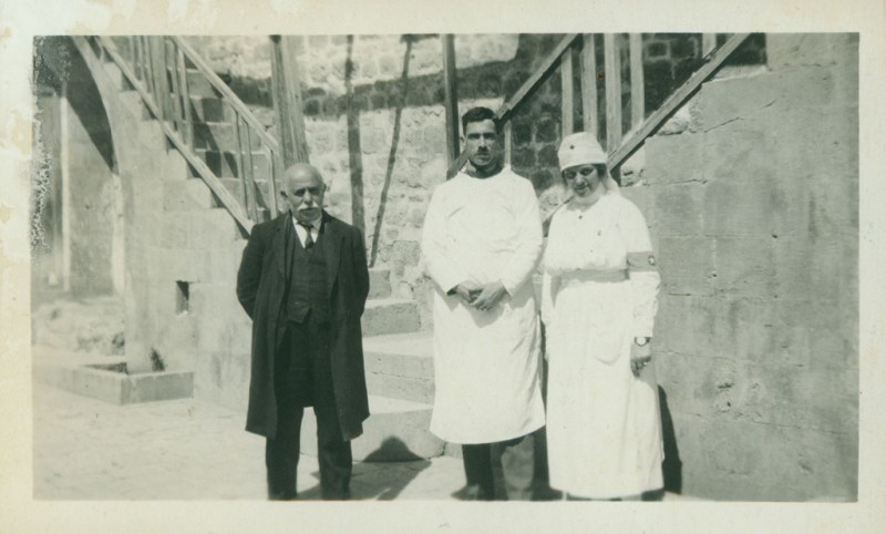 Many adult refugees found jobs with Near East Relief in Aleppo. Armenian health professionals became essential members of the Near East Relief medical staff, which catered to an ever-increasing refugee and orphan population. At left: Orphanage superintendent Rev. Shiradjian, Dr. N. Ishkanian, and Near East Relief nurse Ellen M. Norton, 1921. Mrs. Norton wears an armband with the Near East Relief star. Courtesy of the Armenian General Benevolent Union, Ellen Mary Gerard Collection.