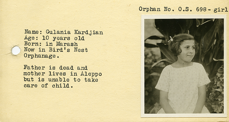 A few months later, Lucine was watching a NERHS Kickstarter video about a collection of a few orphan photos, complete with names and some identifying information, in our Archives. We have almost no information on specific orphans. Lucine was astonished to recognize “Orphan No. O.S. 698 – girl – Gulania Kardjian.” The little girl was her Aunt Vartouhi. It seemed like fate.