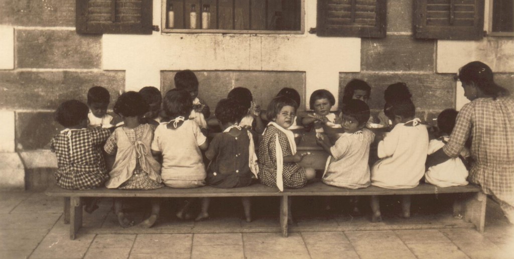 A "mairik" (matron or house mother), right, with a large group of "birdies" at a long table, c. 1923.