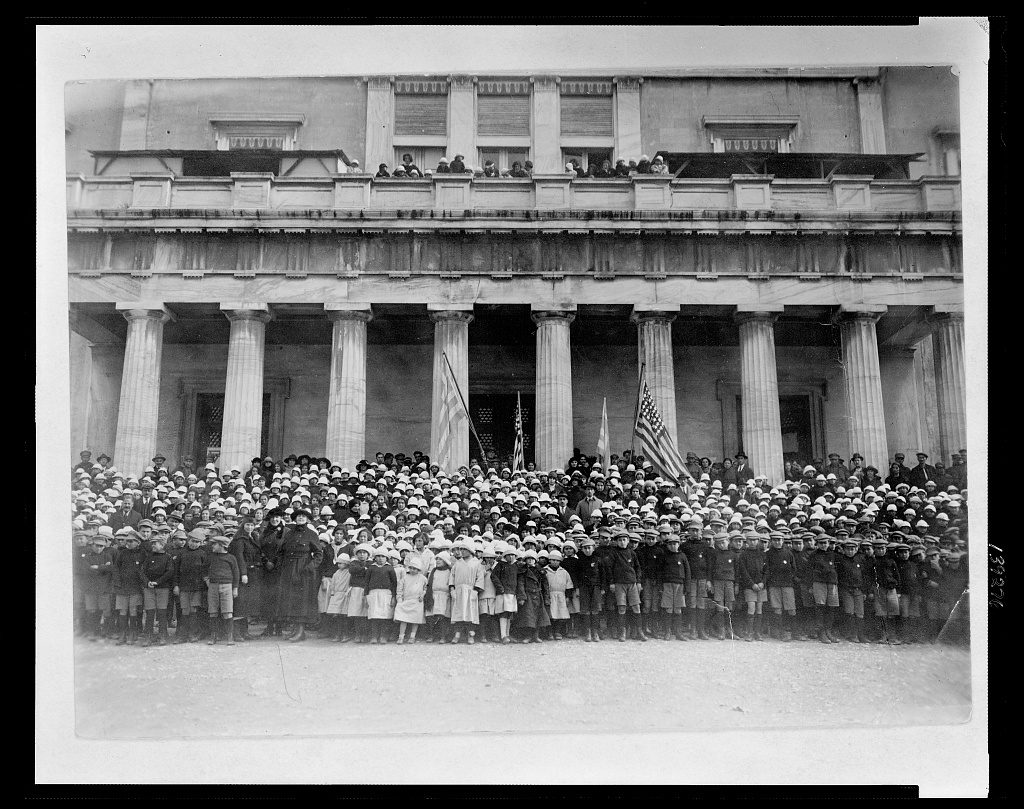 Former Ambassador Henry Morgenthau, Sr., poses with boys from the Zappeion. Athens, Greece, c. 1923. Library of Congress.