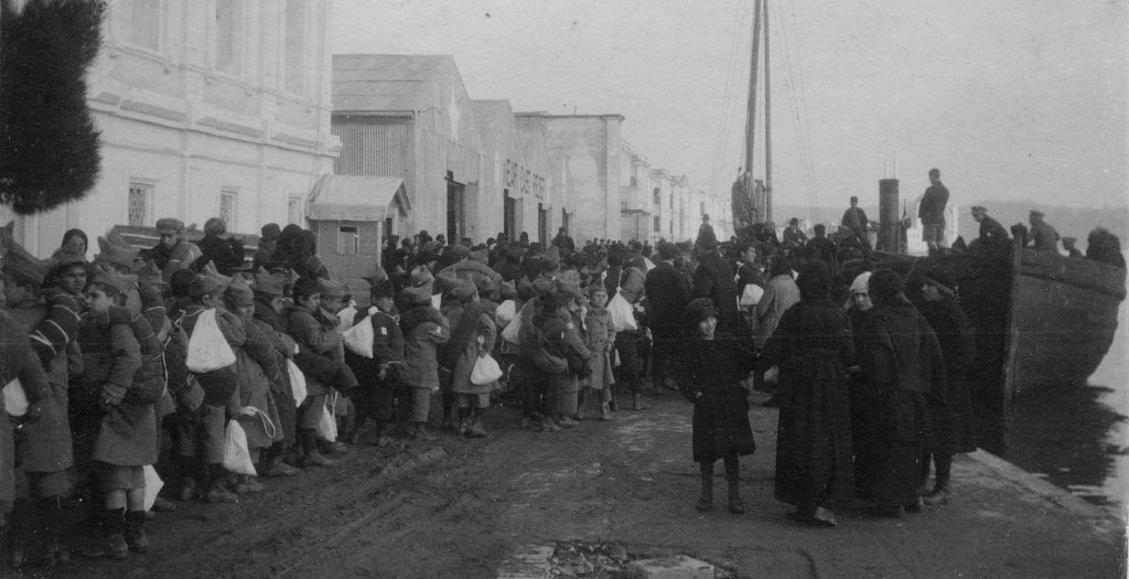 Near East Relief workers evacuating orphans from Constantinople in the wake of the Smyrna Disaster, c.1922. The building with the peaked roof is a Near East Relief warehouse.