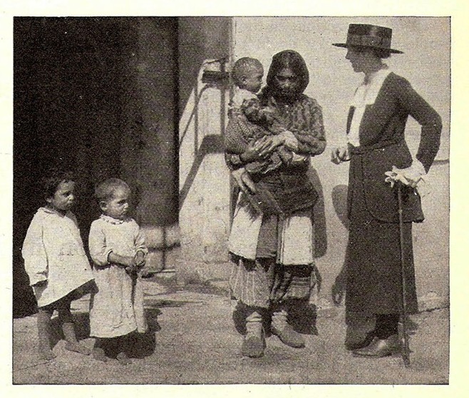 Margie Lin Caldwell visits with a refugee family, 1921.