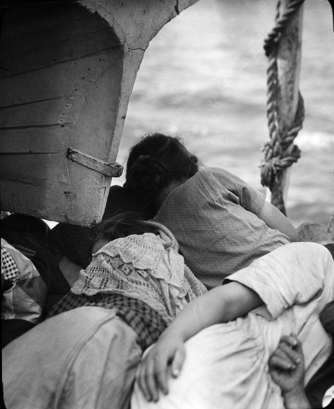 Left: Refugee woman on the deck of a ship. Three children are tucked under a blanket. Date and location unknown.