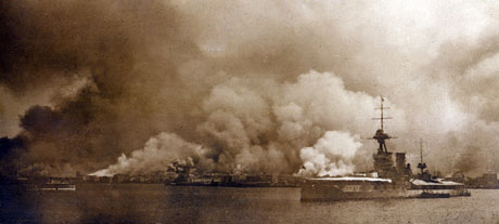 A view of Smyrna burning from coast.