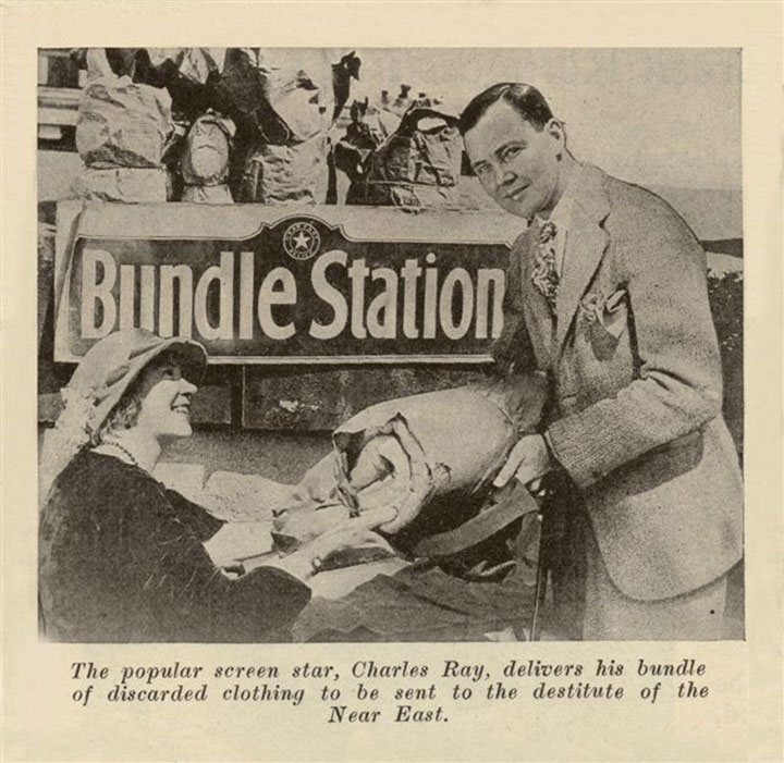 Even Hollywood got involved. Film Star Charles Raye donates used clothing for Bundle Day, 1924