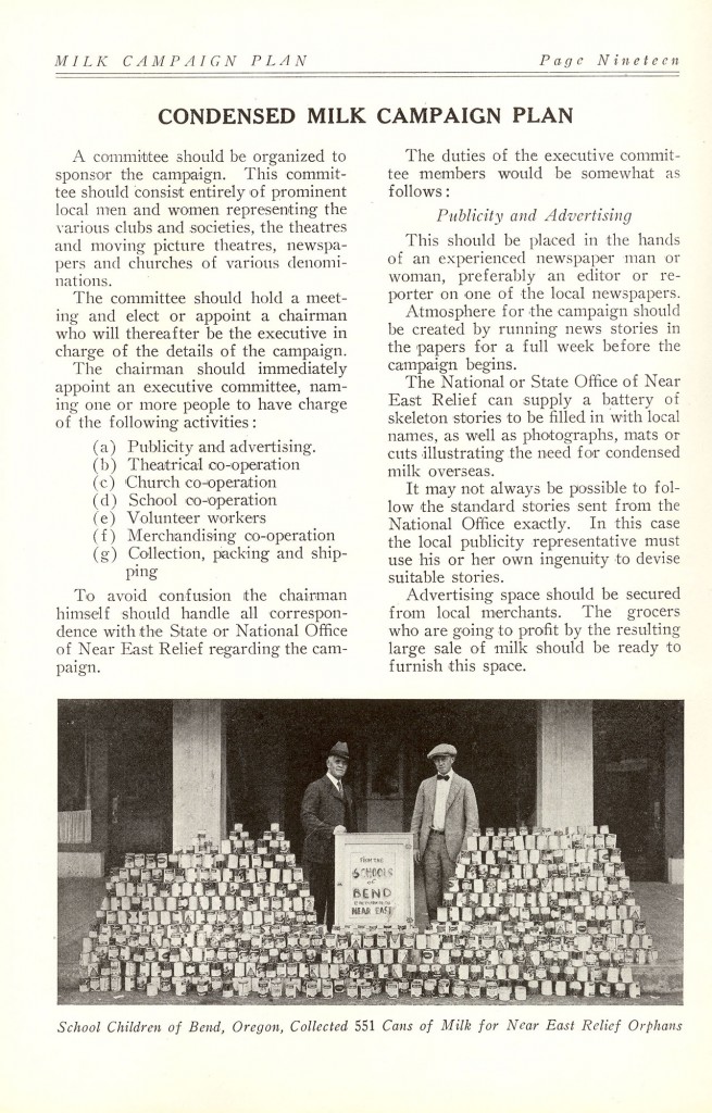 One of the most important resources collected by NER was condensed milk. Milk was a critical source of nutrients for children and was a vital part of their daily meals, along with bread and, occasionally, protein if the relief workers could find enough. These resources were scarce for refugees and as the numbers of children grew, NER embarked on another giving campaign.