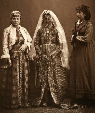 Photo Right: An Armenian bride, center, wearing traditional wedding clothing Constantinople, c. 1873