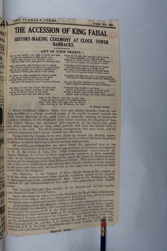 Image Left: August 1921 Baghdad Times article on the installation of Amir Faisal as Iraq’s king, which had been orchestrated by the British. He was the son of the Grand Sharif of Mecca and had fought with T.E. Lawrence in World War I. Faisal served as king until his death in 1933.