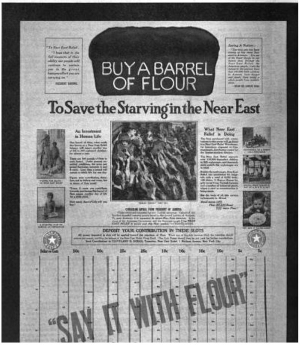 To meet the demand for food, Near East Relief coordinated with business groups around the country to generate donations. One such campaign encouraged people to donate coins and flour while doing their regular shopping.